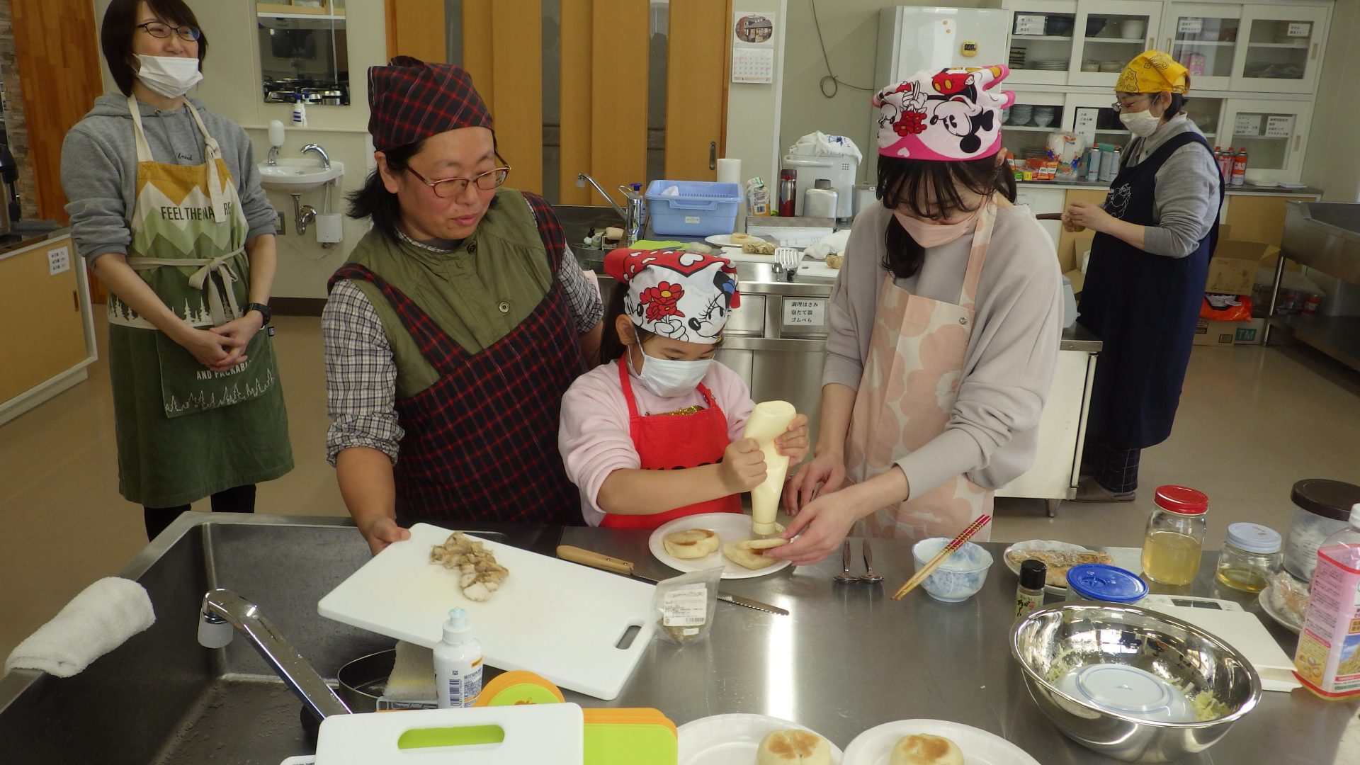 11月17日(日)「親子クッキング」が開催され、髙田廣美先生(手向)に教わりながら「鶏ハムを使ったチキンバーガー」作りに挑戦しました。あらかじめ先生に準備していていただいたパン生地を成形して、今回はホットプレートで焼いてみました。ホットプレートからは焼きたての美味しそうなパンのにおいがしていました。バンズに挟む鶏ハムとコールスローサラダつくりは子どもたちもお母さんと協力しながら頑張って作っていました。 作ったバーガーは少し時間をおいてから食べるのがベストタイミングということでお土産にして、コールスローサラダと鶏肉を焼いたときに出たエキスで作ったスープをみんなで試食しました。とても簡単で、美味しいハンバーガーを作ることができました。家でもぜひ作ってみてください!
